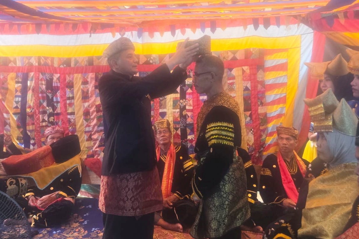 — Edison MKes Dt Rajo Indo sebagai panghulu kaum Sikumbang malewakan gala Mandaro (Bandaro–red) Koto kepada Jeky Yul pada acara palewakan gala tersebut di Koto Pulai Nagari Kambang Timur, Ahad (12/4/2026).