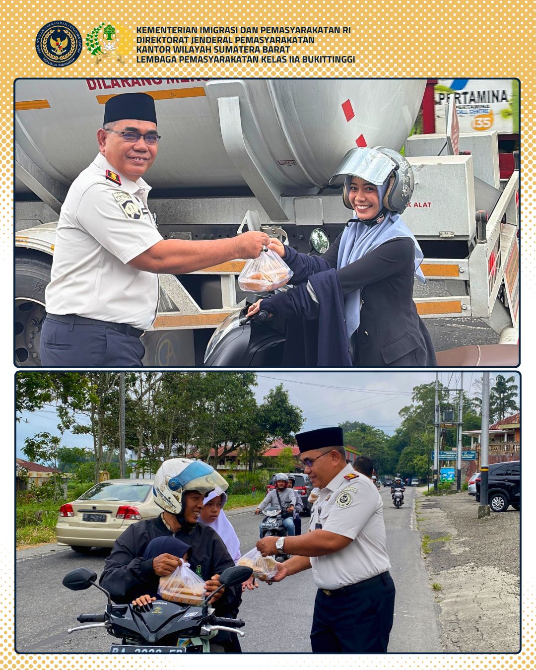 — Dalam rangka menyemarakkan bulan suci Ramadhan 1447 H, Lembaga Pemasyarakatan (Lapas) Kelas IIA Bukittinggi melaksanakan kegiatan pembagian takjil kepada masyarakat yang melintas di jalan raya sekitar lingkungan Lapas. Kegiatan ini dilaksanakan pada Senin, 9 Maret 2026 di Jalan Raya Payakumbuh–Bukittinggi Km.08 tepat di depan Lapas Kelas IIA Bukittinggi.