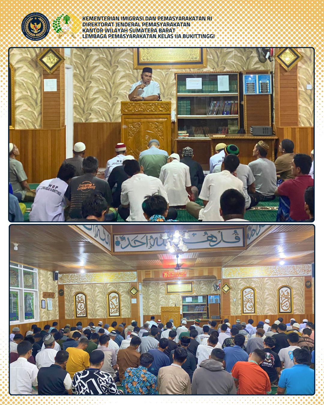 Pelaksanaan kegiatan ibadah selama bulan Ramadhan di Lapas Kelas IIA Bukittinggi terus berjalan dengan aman, tertib, dan kondusif. Hal ini merupakan bagian dari program pembinaan kepribadian bagi warga binaan, khususnya dalam meningkatkan nilai-nilai spiritual dan keagamaan.