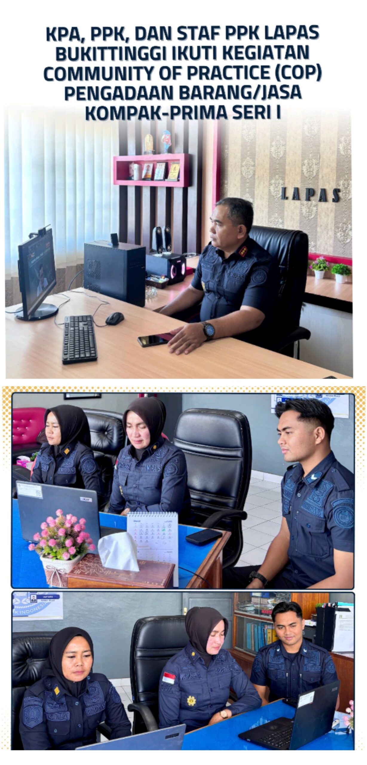 – Dalam rangka meningkatkan kompetensi serta pemahaman terkait pelaksanaan pengadaan barang dan jasa pemerintah, jajaran Lembaga Pemasyarakatan Kelas IIA Bukittinggi yang terdiri dari Kuasa Pengguna Anggaran (KPA), Pejabat Pembuat Komitmen (PPK), serta staf PPK mengikuti kegiatan Community of Practice (CoP) Pengadaan Barang/Jasa KOMPAK-PRIMA Seri I yang diselenggarakan oleh Kementerian Imigrasi dan Pemasyarakatan Republik Indonesia melalui Sekretariat Jenderal.