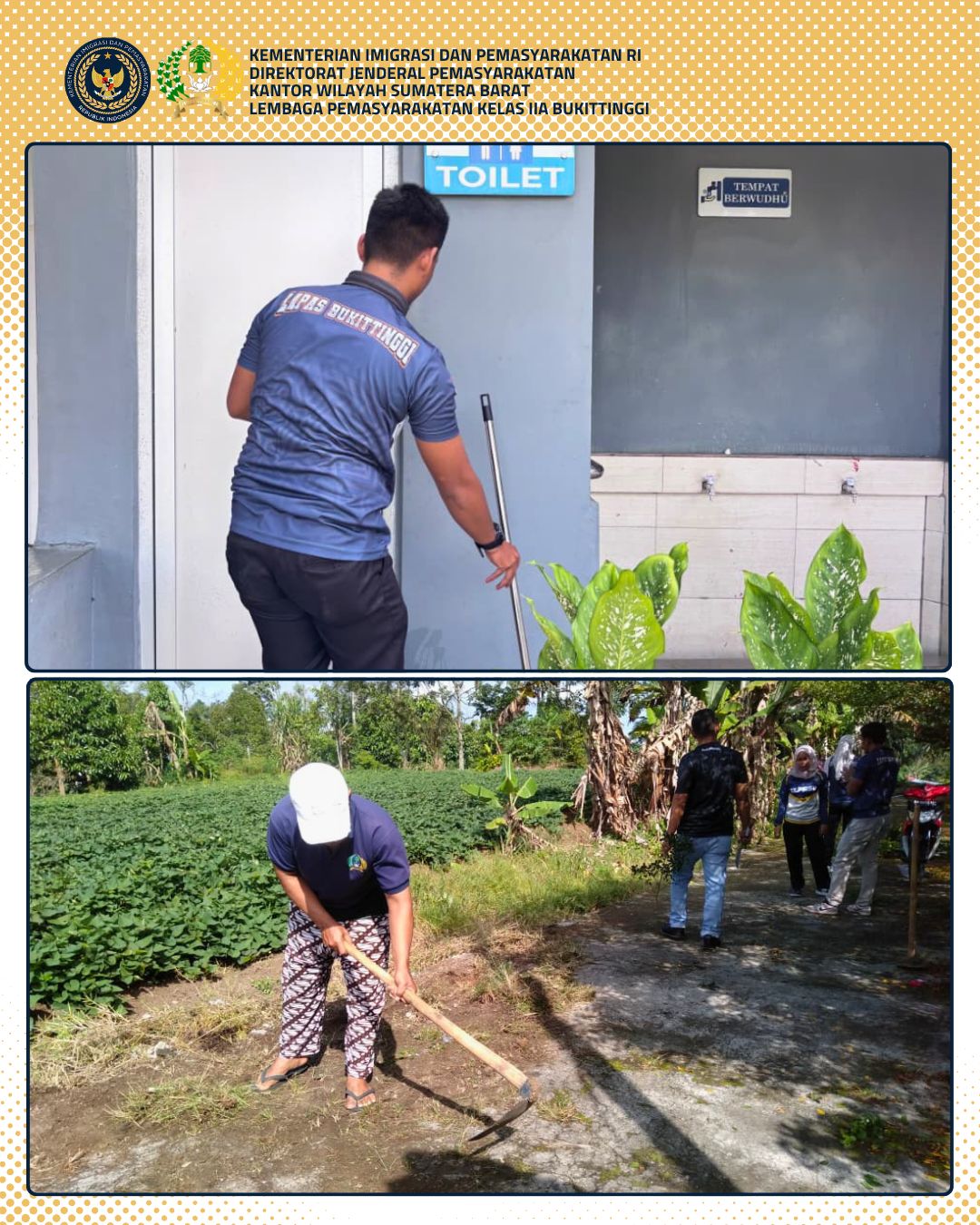 — Dalam rangka memperingati Hari Bakti Pemasyarakatan (HBP) ke-62, Lembaga Pemasyarakatan (Lapas) Kelas IIA Bukittinggi melaksanakan kegiatan bersih-bersih lingkungan satuan kerja pemasyarakatan, sebagai bentuk komitmen dalam menciptakan lingkungan yang bersih, sehat, dan nyaman.