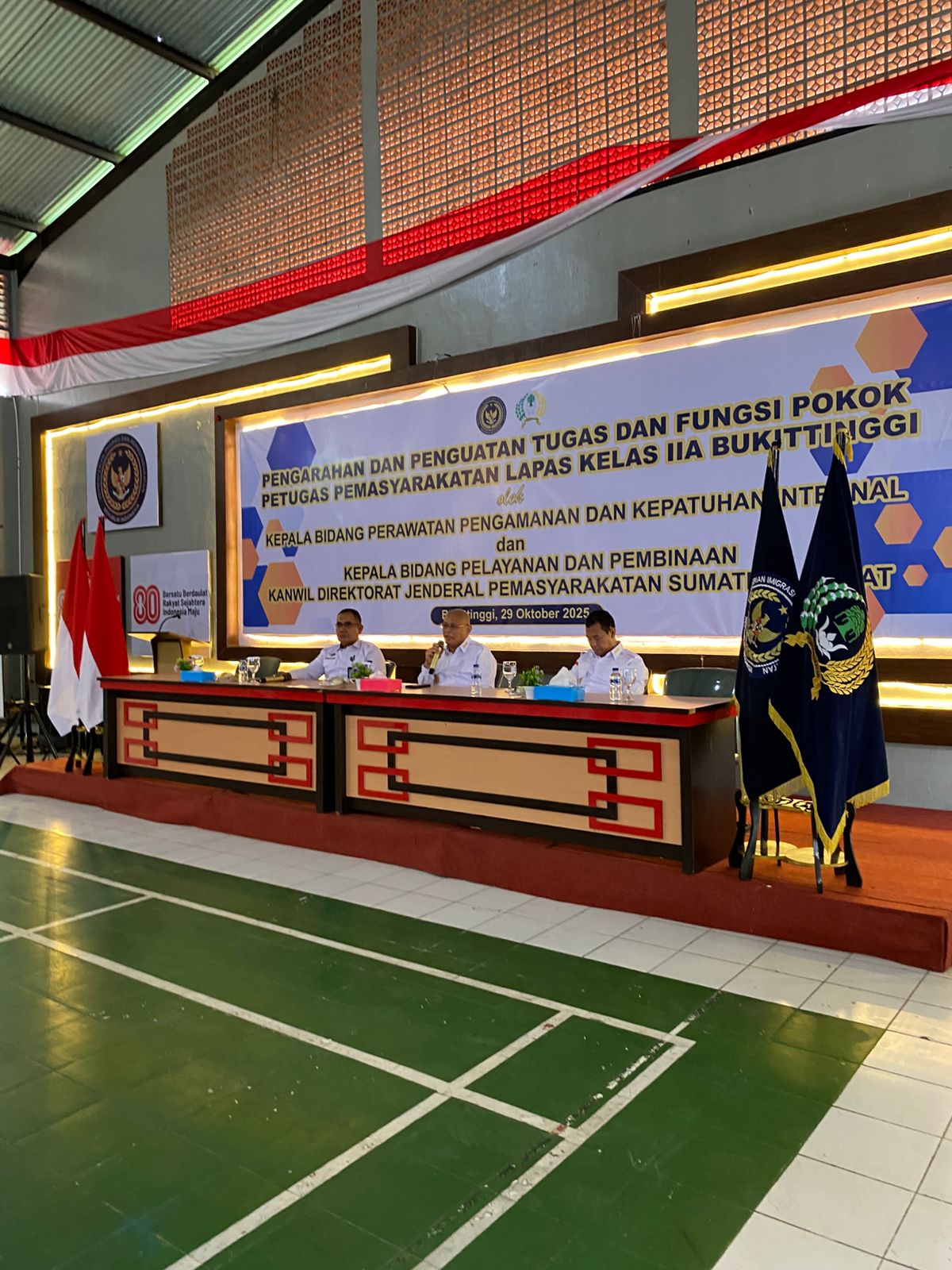 29 Oktober 2025 —Suasana Aula Lapas Kelas IIA Bukittinggi pagi ini dipenuhi semangat dan antusiasme seluruh jajaran pegawai. Seluruh staf dan petugas pengamanan hadir lengkap dalam kegiatan pengarahan dan penguatan yang disampaikan langsung oleh Kabid Keamanan dan Ketertiban/Pemasyarakatan (Patnal) serta Kabid Pelayanan Tahanan, Kesehatan, dan Rehabilitasi, serta Pembinaan Narapidana (Yanbin) Kanwil Ditjenpas Sumatera Barat.
