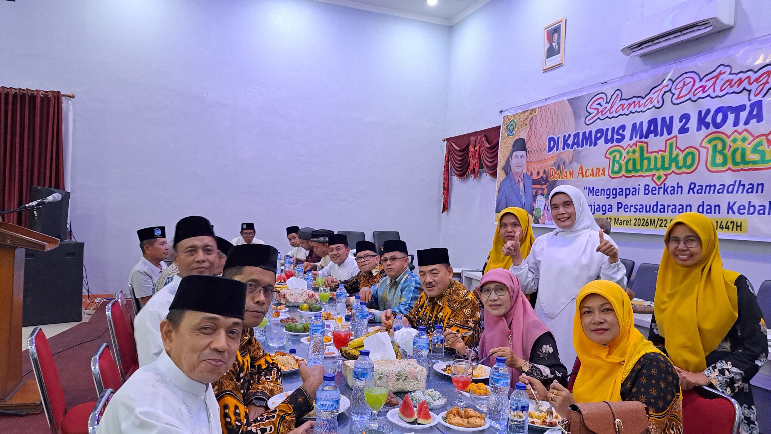 MAN 2 Padang menggelar buka puasa bersama di Aula Abu Bakar Shiddiq, Kamis (12/3/2026). Kegiatan yang mengusung tema “Menggapai Berkah Ramadhan dengan Menjaga Persaudaraan dan Kebahagiaan” ini diikuti guru dan pegawai di lingkungan madrasah tersebut.