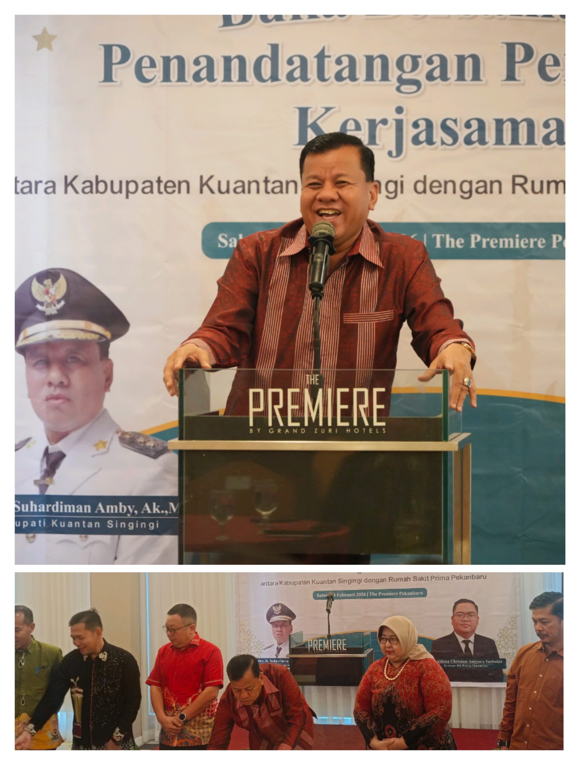 — Bupati Suhardiman Amby menyaksikan penandatanganan nota kesepahaman (MoU) penanganan pasien rujukan program Universal Health Coverage (UHC) antara Pemerintah Kabupaten Kuantan Singingi dan manajemen RS Prima Pekanbaru, Sabtu (28/2/2026) di Pekanbaru.