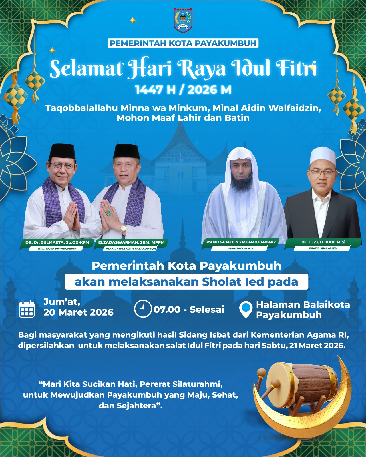 Payakumbuh — Pemerintah Kota Payakumbuh akan menggelar salat Idul Fitri 1447 Hijriah di halaman Kantor Balai Kota Payakumbuh pada Jumat (20/03/2026) mulai pukul 07.00 WIB.