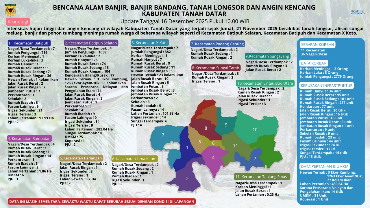 Sebagaimana bencana alam banjir bandang dan tanah lonsor melanda beberapa Nagari di Kabupaten Tanah Datar pada 24 hingga 27 Novenber 2025 lalu mengakibatkan lebih kurang 2.779 jiwa masih mengungsi, 9 unit sekolah yang rusak dan 20 jembatan yang putus, pemerintah daerah lakukan percepatan penanggulangannya.