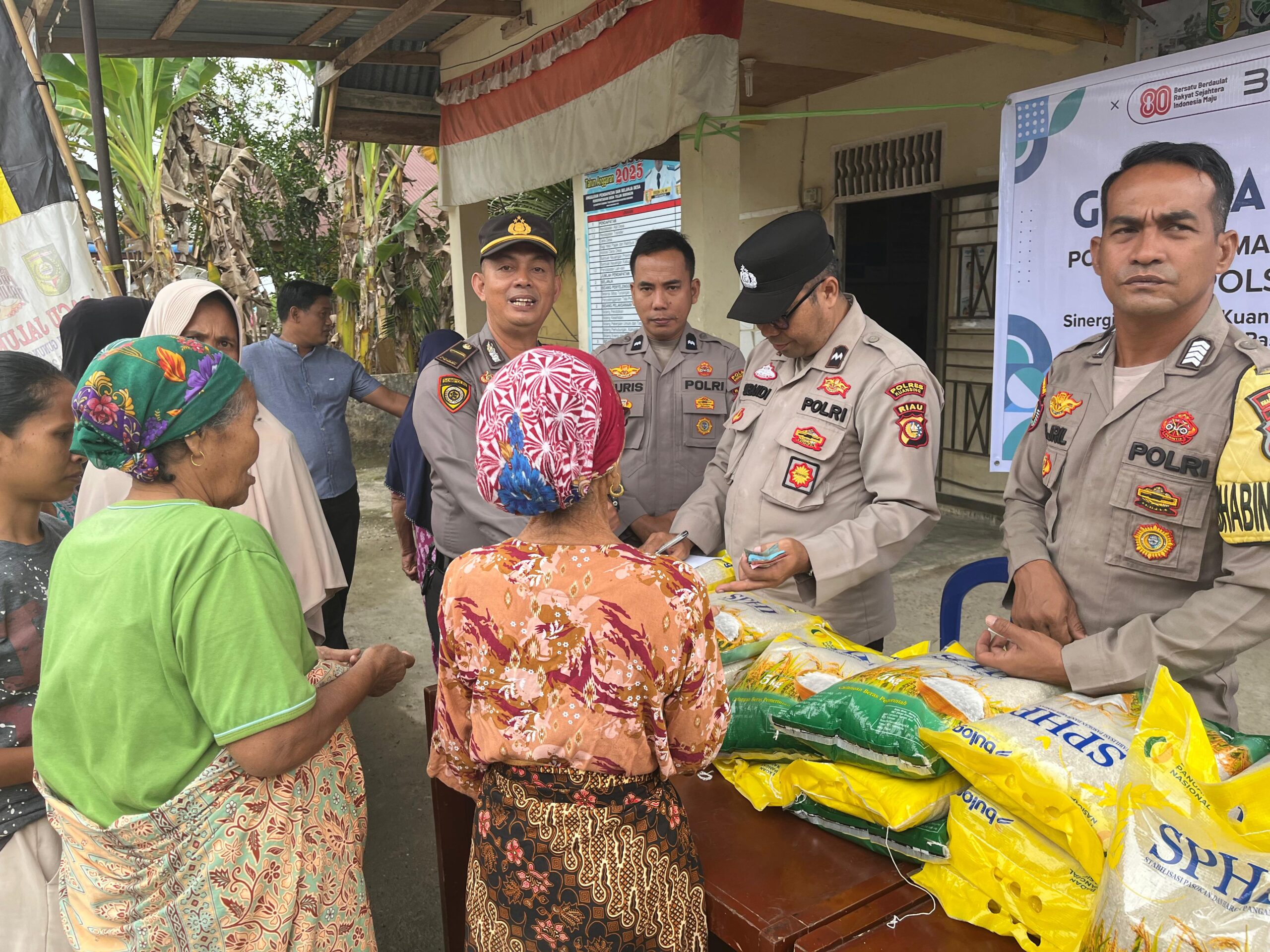 Di wilayah hukum Polsek Kuantan Mudik, kegiatan berlangsung di Pasar Desa Teluk Beringin, Kecamatan Gunung Toar, mulai pukul 09.30 WIB. Kegiatan ini dipimpin langsung Kapolsek Kuantan Mudik Iptu Riduan Butar Butar, SH., MH., dengan dukungan jajaran subsektor, Bhabinkamtibmas, dan masyarakat setempat. Sama seperti di dua wilayah lainnya, beras Bulog sebanyak 100 karung didistribusikan dengan harga terjangkau.