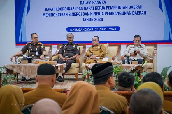 Sebagaimana Bupati Tanah Datar Eka Putra membuka Rapat Koordinasi dan Rapat Kerja Pemerintah Kabupaten Tanah Datar Tahun 2026 di Aula Kantor Bupati, Selasa (21/4/2026), ini digelar untuk memperkuat sinergi serta mendorong peningkatan kinerja pembangunan daerah yang transparan, akuntabel, dan bebas dari praktik korupsi, kolusi, dan nepotisme (KKN).
