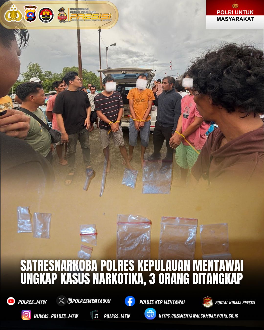 Kapolres Kepulauan Mentawai, AKBP Rory Ratno A., S.E., M.M., M.Tr.Opsla, melalui Kasat Resnarkoba, IPTU Ali As Mardoni, S.H., menyatakan bahwa tiga orang telah diamankan terkait kasus tersebut, yaitu A.R.S (31), warga Tuapejat; R.(33), warga Saliguma; dan G.(44), warga Tuapejat.