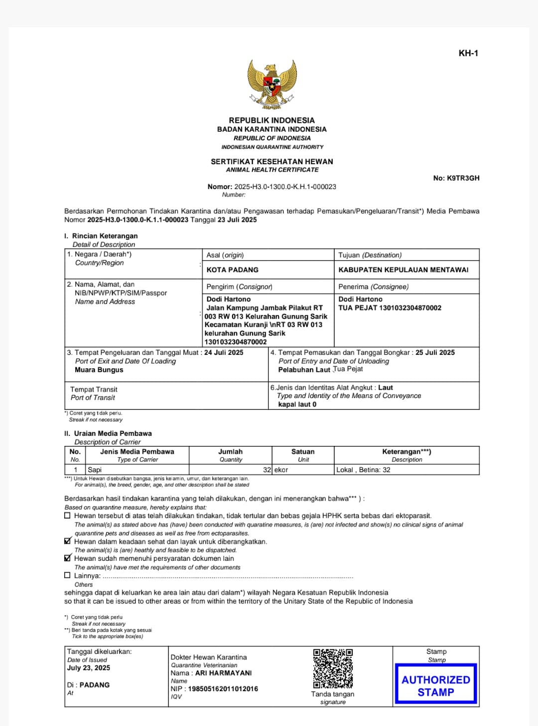 Dokumen tersebut menjadi bukti sahih bahwa sapi bantuan pokir yang masuk ke Kabupaten Kepulauan Mentawai telah melalui proses pemeriksaan kesehatan sebelum didistribusikan. Dengan demikian, tudingan sebagian warga yang mengaitkan kematian puluhan sapi lokal dengan kedatangan sapi pokir tidak memiliki dasar kuat.