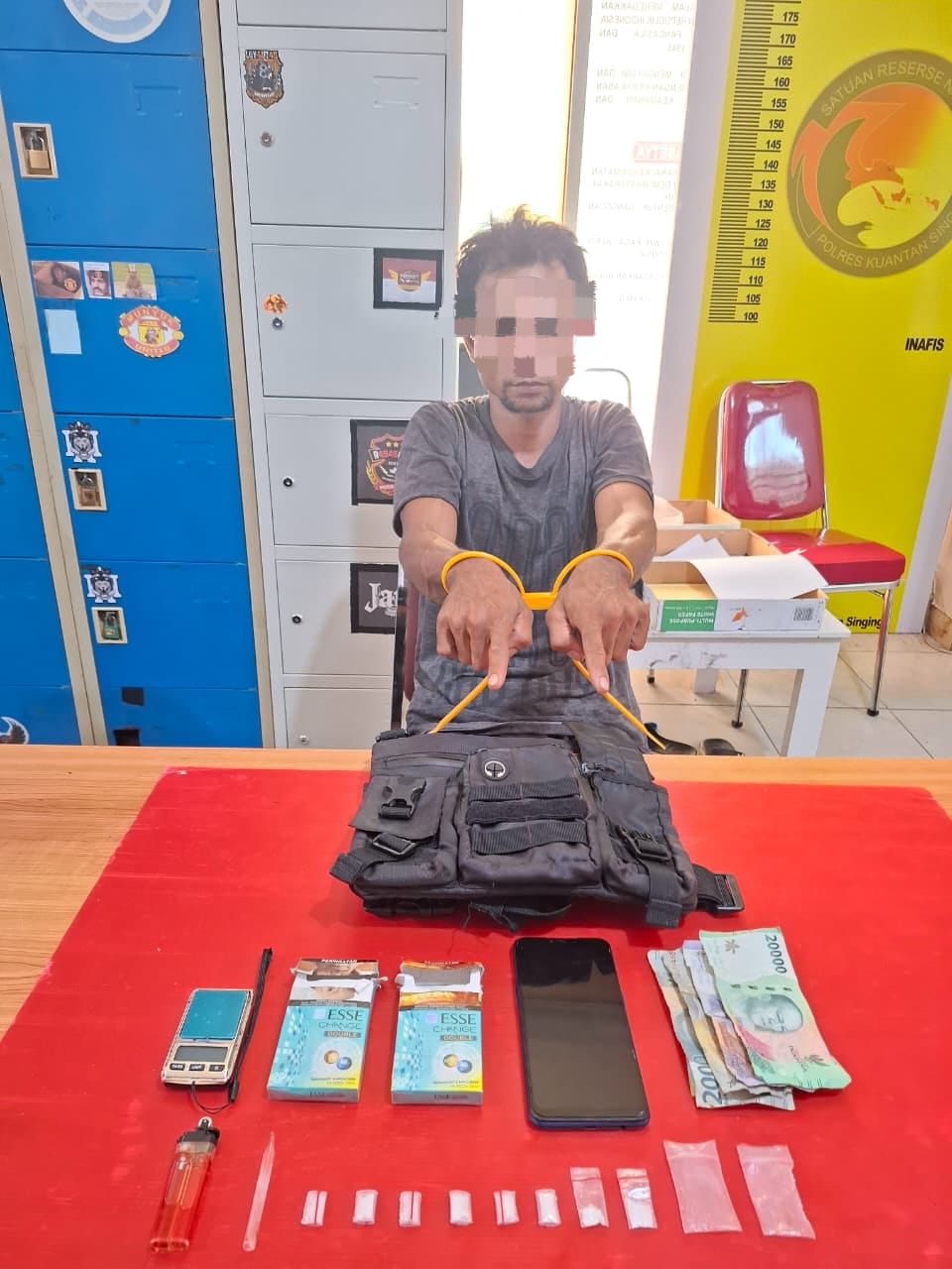 Dari hasil pemeriksaan, tersangka mengaku bahwa seluruh barang haram tersebut merupakan titipan dari seorang berinisial D (DPO) untuk diedarkan di wilayah Kecamatan Singingi. Selain delapan paket kecil Shabu dengan berat kotor sekitar 2,18 gram, petugas juga mengamankan sejumlah barang bukti lain seperti timbangan digital, pipet kaca pyrex, dua kotak rokok merek ESSE Double Change, plastik klip bening kosong, satu korek api mancis, satu tas dada warna hitam, serta satu unit handphone merk OPPO A35 warna biru dongker.
