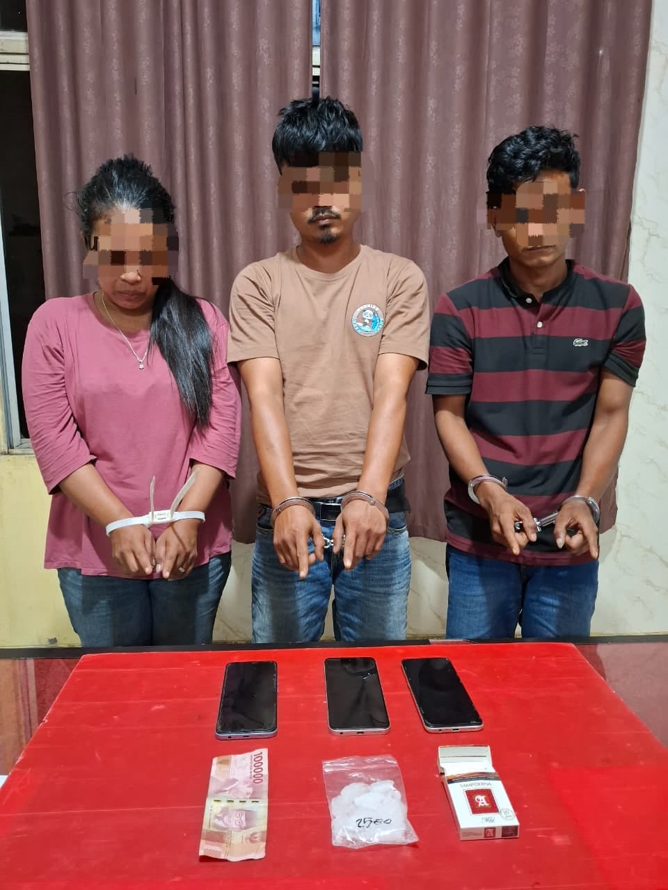 Ketiga pelaku yang diamankan yakni berinisial D(33), seorang wiraswasta asal Desa Pisang Berebus, Kecamatan Gunung Toar, inisial IB(30), pelajar/mahasiswa asal Seberang Cengar, Kecamatan Kuantan Mudik, dan LS(34), ibu rumah tangga warga Bukit Pedusunan, Kecamatan Kuantan Mudik. Ketiganya diduga berperan sebagai pengedar narkoba.